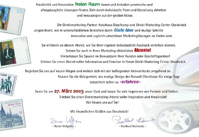 Manchmal muß "Satz" ein bisschen mehr sein, als ein Text in Blocksatz-Spalten. Im Beispiel unten sind es asymmetrische Zeilen, optisch ansprechend, mit einem Zeilenwechsel nach Wortrhythmik und hervorgehobenen Schlüsselbegriffen.
